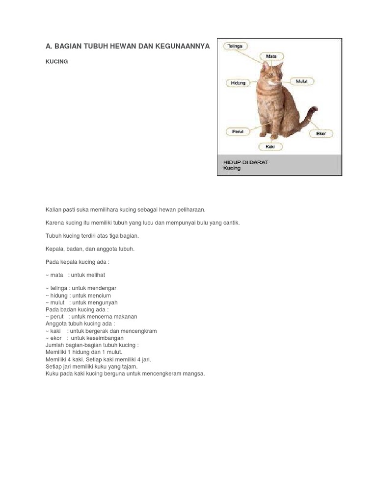 Bagian-bagian tubuh hewan antara lain kepala sayap mata kaki paruh dan sebagainya. Gambar 121 Kucing dan bagian-bagiannya Tubuh kucing terdiri atas tiga bagian. Namun ada juga beberapa hewan yang memiliki bagian tubuh berbeda dengan hewan yang lainnya.
